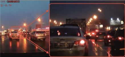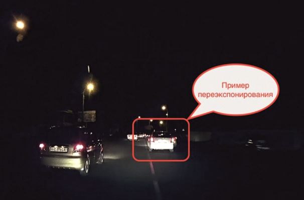 Из-за наличия в кадре источников яркого света, таких как осветительные приборы, фары встречных автомобилей, яркие неоновые вывески, одновременно с большими неосвещенными областями, видеорегистратор ошибается с экспозицией. Особенно неприятно когда «засвеченным» оказывается непосредственно номер впередиидущего автомобиля.
