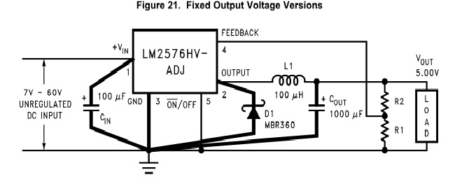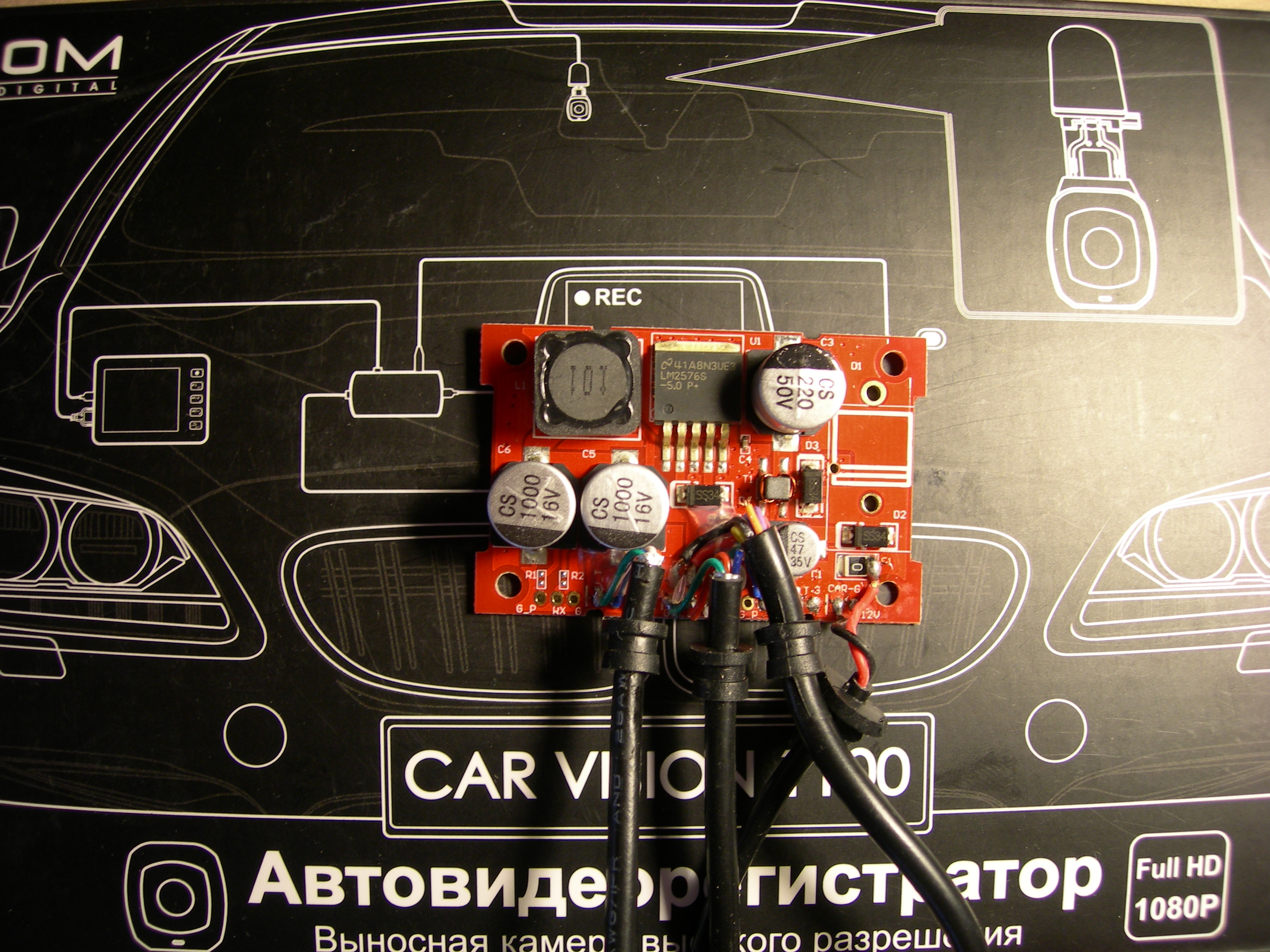 Экспериментировал вчера с подключением к тв. Помехи на радио нет, на видео есть, но меньше, горизонтальные полоски, но вот со звуком хуже - идет визг, при включении контролёра. Пробовал подавать питание от автомобильной 2А зарядки Belkin F8J090BT04-BLK на выход контролера(5в), помех практически нет, звук чистый. Над схемотехникой нового контролера желательно поработать: 1. добавить LC-фильтры, как и рекомендует датшит данной микросхемы - ripple filter: 2. правильно развести землю и брать её с одной точки возле 3 вывода LM2576 согласно датшиту: 3. проводники видео/аудио выхода от видеорегистратора не заводить в контролер, а соединить с разъёмом тюльпанов перед ним. 4. экранировать контролёр фольгой.