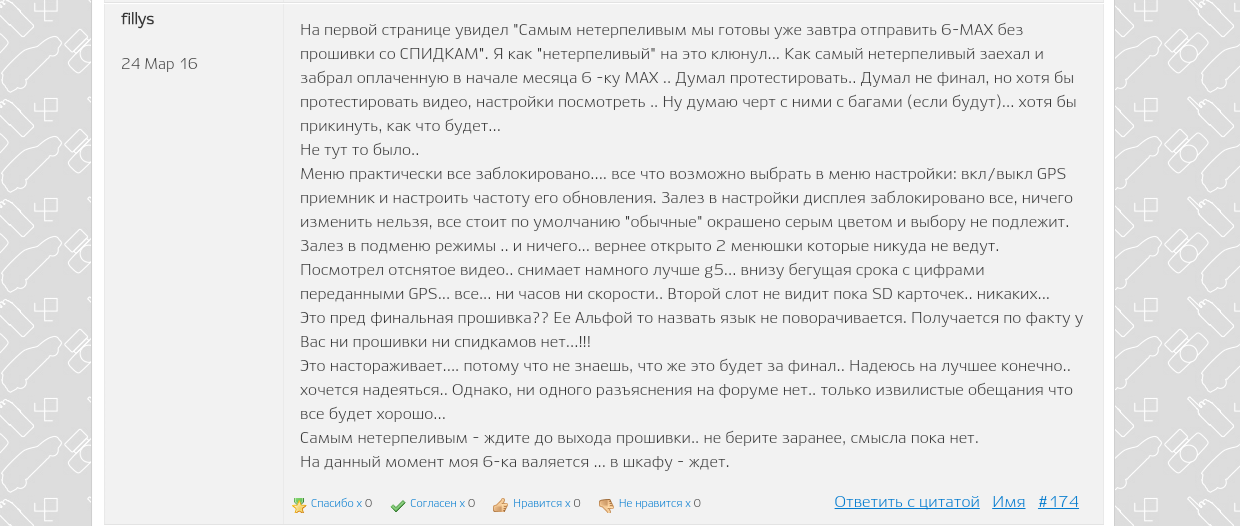 Это мой пост на Datacam ... что интересует то про 6 MAX? Видео пока мало .. заберу машину из сервиса на днях выложу если надо.. Скриншоты стоп кадров разумнее выложить дополнительно. Но, по первым кадрам 6-ки.. видео намного лучше чем на моем G5 Sity Limited... Маленькая предыстория покупки.. Забирал его сам в Датакаме карточку CD не дали.. Когда забирал ждал минут 5, сказали, что в наличии их почти нет(это было 11.03). Как их понимать - не знаю. Так же сказали, что многие требуют возврат денег - устали ждать. Я сам устал ждать... Сначала сделал пред заказ.. прошла неделя - мимо... Звоню - как с заказом дела.. Вы оплатили? Я - нет.. Будем пока работать по предоплаченным.. Дай думаю оплачу, черт с ним.. Перезаказал - в результате висело 2 заказа ..Как деньги упали перезвонили минут через 5 -Мы отзвонимся Вам и согласуем время.. А второй заказ висит, как убрать? Они- неважно все равно никто по нему звонить не будет (!!! тут я немного охренел). Еще неделя ожидания... Сам звоню.. Ну и тут история с "вы можете забрать без спидкама".. Забрал... ну остальное выше в скриншоте, что выложил Kulibun.... Вот такая засада... Но, вроде ребята в Датакаме работают.. Встречают с извиняющимися улыбками. Я приезжал к ним с зависши G5 - не включался. Замена платы в течении минут 3-х. А я брал не у них его... Так что, впечатление пока(!) хорошее.. Да, косяк со сроками.. ну всяко бывает.. То что прошивку не дают, хотя бы бетку - вопрос уже к ним. НО!.. я его хотел - я его взял, дальше посмотрим... Аппарат мне нравиться. Загорелся перейти на 6 с G5. А 5-ка вылизана во всем, денег мне сэкономила дофига..!!!! Нравииитсяяяя!!! Надеюсь 6-ка не подведет.. За многословие не ругать... Вы хотели, я сюда зашёл...
