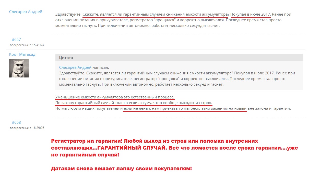 Очередной кидок,...мягко завуалированный под неотложную помощь своим клиентам. Заметьте как тонко всё обыграно,...якобы срок гарантии на акум уже прошёл (у ДК это 3 месяца),...но Датакам якобы идёт на встречу своим клиентам...и бесплатно всё поменяет. Но если быть настойчивым и почитать "Закон о защите прав потребителей",...мы найдём в нём вот это ... Статья 19. Сроки предъявления потребителем требований в отношении недостатков товара И в этой статье есть следующее: 3. Гарантийные сроки могут устанавливаться на комплектующие изделия и составные части основного товара. Гарантийные сроки на комплектующие изделия и составные части исчисляются в том же порядке, что и гарантийный срок на основной товар. Гарантийные сроки на комплектующие изделия и составные части товара считаются равными гарантийному сроку на основное изделие, если иное не установлено договором. В случае, если на комплектующее изделие и составную часть товара в договоре установлен гарантийный срок меньшей продолжительности, чем гарантийный срок на основное изделие, потребитель вправе предъявить требования, связанные с недостатками комплектующего изделия и составной части товара, при их обнаружении в течение гарантийного срока на основное изделие, если иное не предусмотрено договором. Если на комплектующее изделие установлен гарантийный срок большей продолжительности, чем гарантийный срок на основной товар, потребитель вправе предъявить требования в отношении недостатков товара при условии, что недостатки комплектующего изделия обнаружены в течение гарантийного срока на это изделие, независимо от истечения гарантийного срока на основной товар. Источник: http://ozppzakon.ru/19 Так чем же обусловлена такая галантность к своим покупателям,...открытостью КБ Датакам...или всё же законодательством РФ.