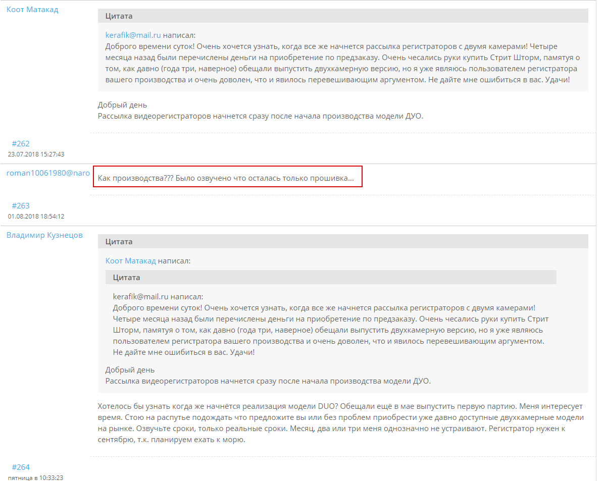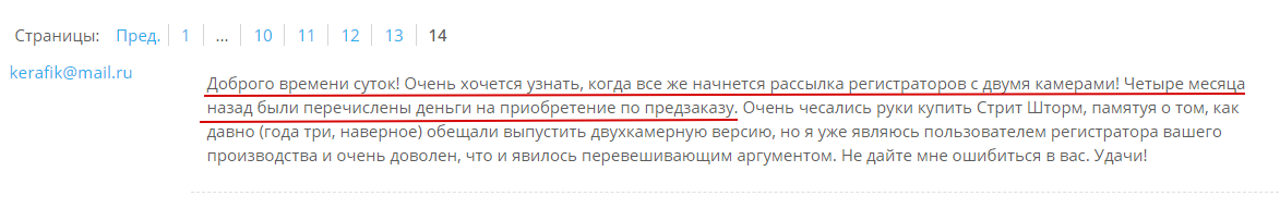 Эти отмазки уже оскомину набили и вызывают только раздражение, балаболов из ДК никто за язык не тянул, разве это не их слова? "Планируемая отправка заказов - через месяц" Если кто не в курсе, это объявление на их сайте висит с МАРТА месяца, а сегодня уже, так, между прочим - 5 Августа Хоть кто нибудь по предзаказу получил их виртуальный регистратор?