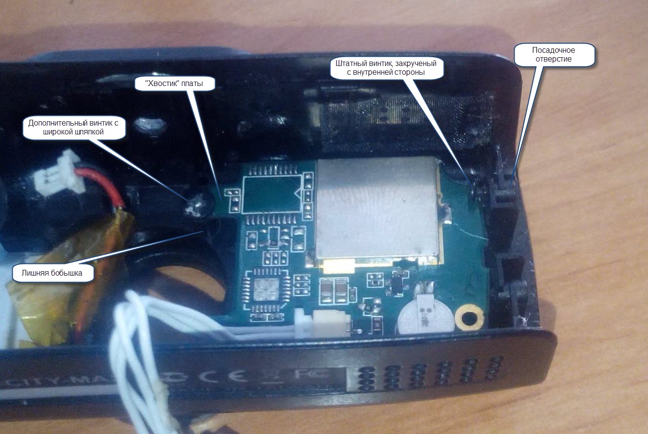 Вкурутил штатный винтик, но с другой стороны отверстия. Таким образом, винтик, находясь шляпкой внутри регистратора, дополнительно прижал этой шляпкой плату к корпусу, обеспечив тем самым хорошее крепление платы внутри регистратора.