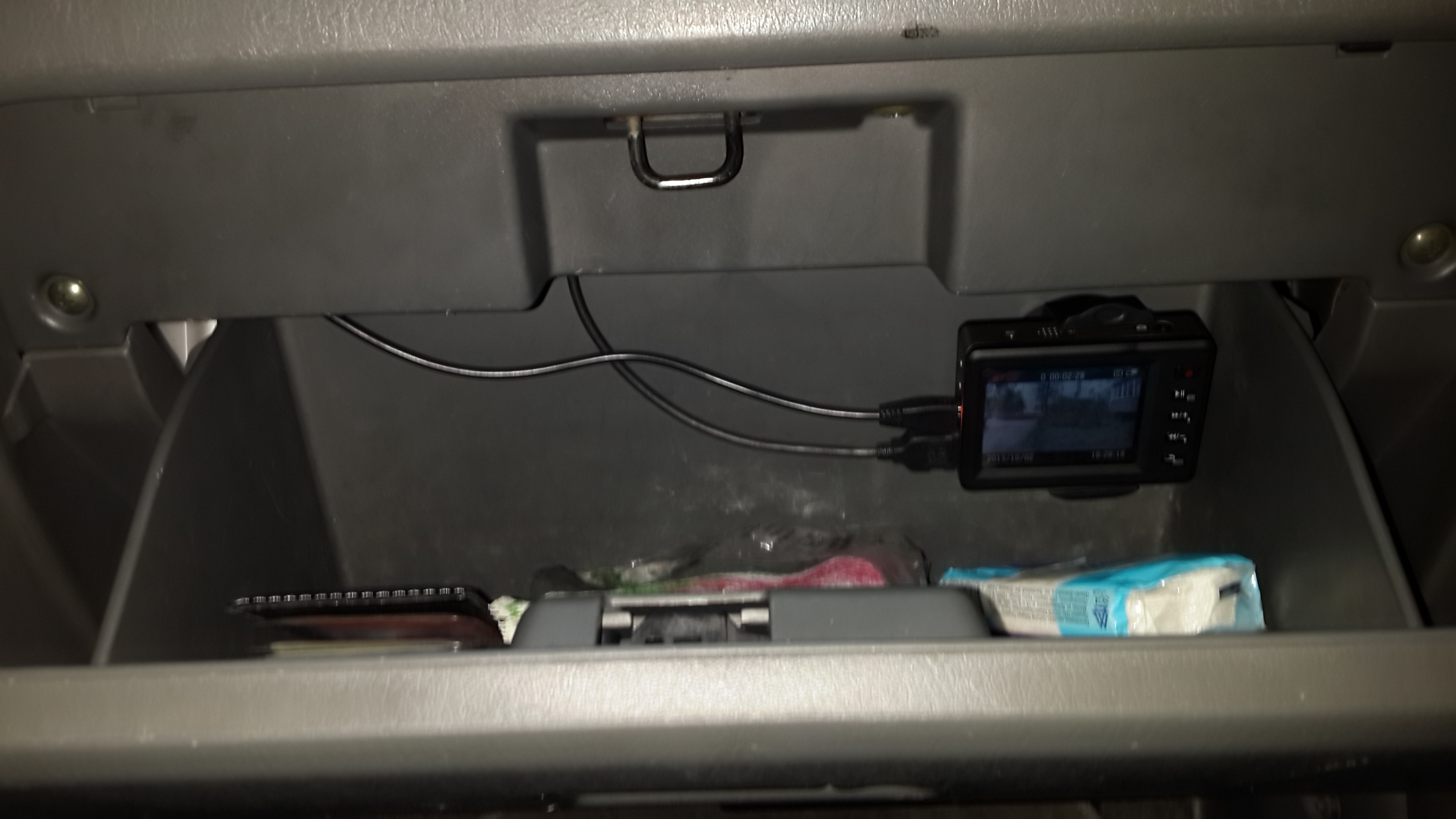 Я больше всего ценю приборы, которые работают сами, без моего участия. Поэтому воткнул питание незаметно (у меня уже была сделана под обшивкой розетка прикуривателя спрятана, питающаяся от плафона), оно пропадает через 15 минут после выключения двигателя - и все, даже кнопку наружу выводить не стал. Оно там где-то работает при включенном двигателе, надо будет - достану, а в повседневной жизни оно должно быть совсем незаметно (почему я и городил огород с уменьшением габаритов камеры и разворотом кабеля).