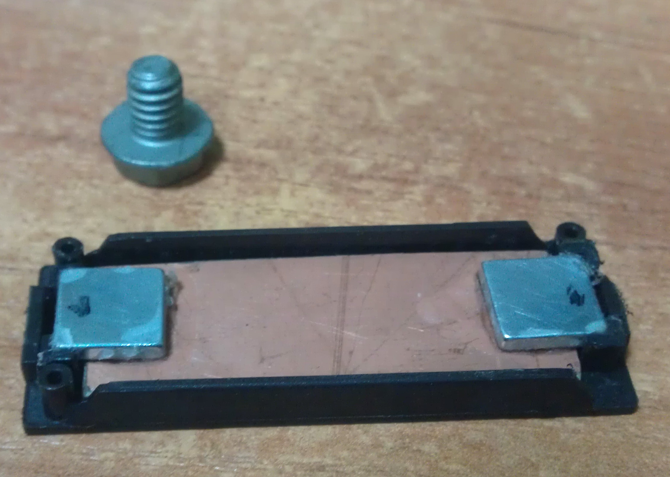 Основную же фиксирующую силу обеспечивает достаточно большой неодимовый магнит, который притягивает стальной болт с фоторезьбой, которым планка крепится к регистратору.