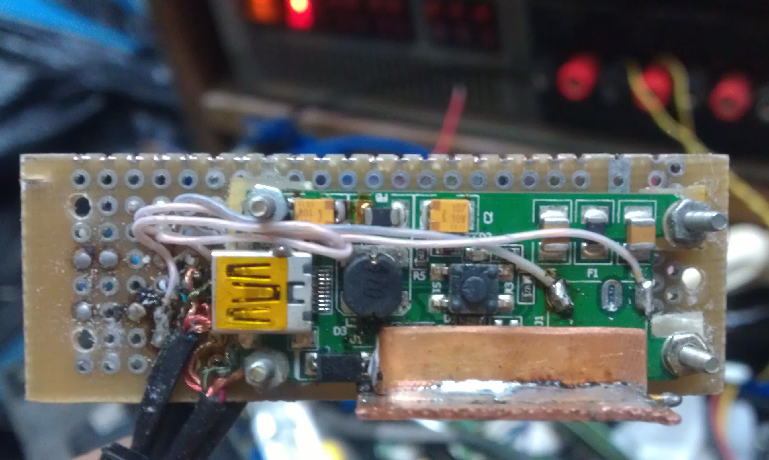 Стабилизатор установлен на макетную плату, которая и служит его основанием, кроме того она используется дла распайки кабелей.