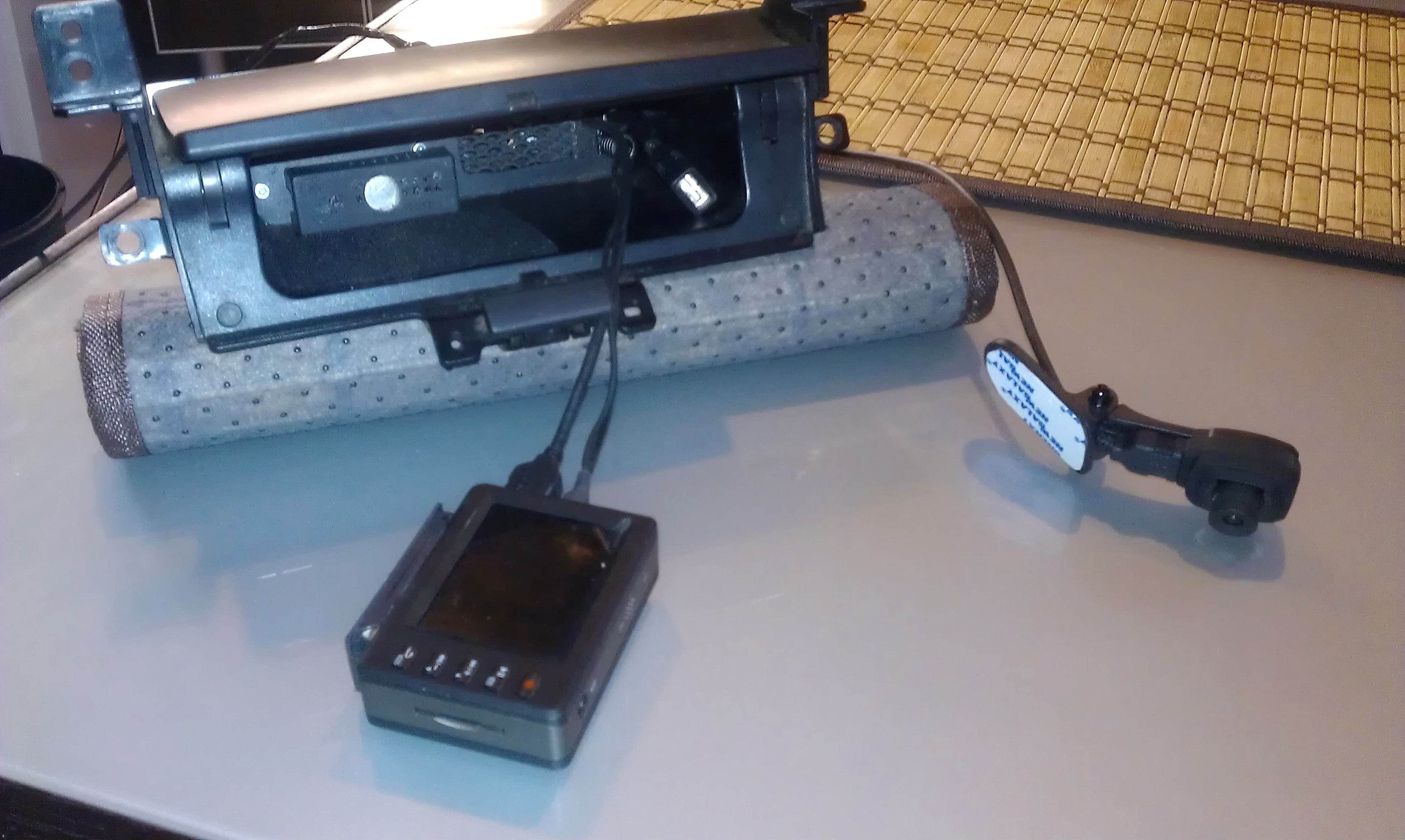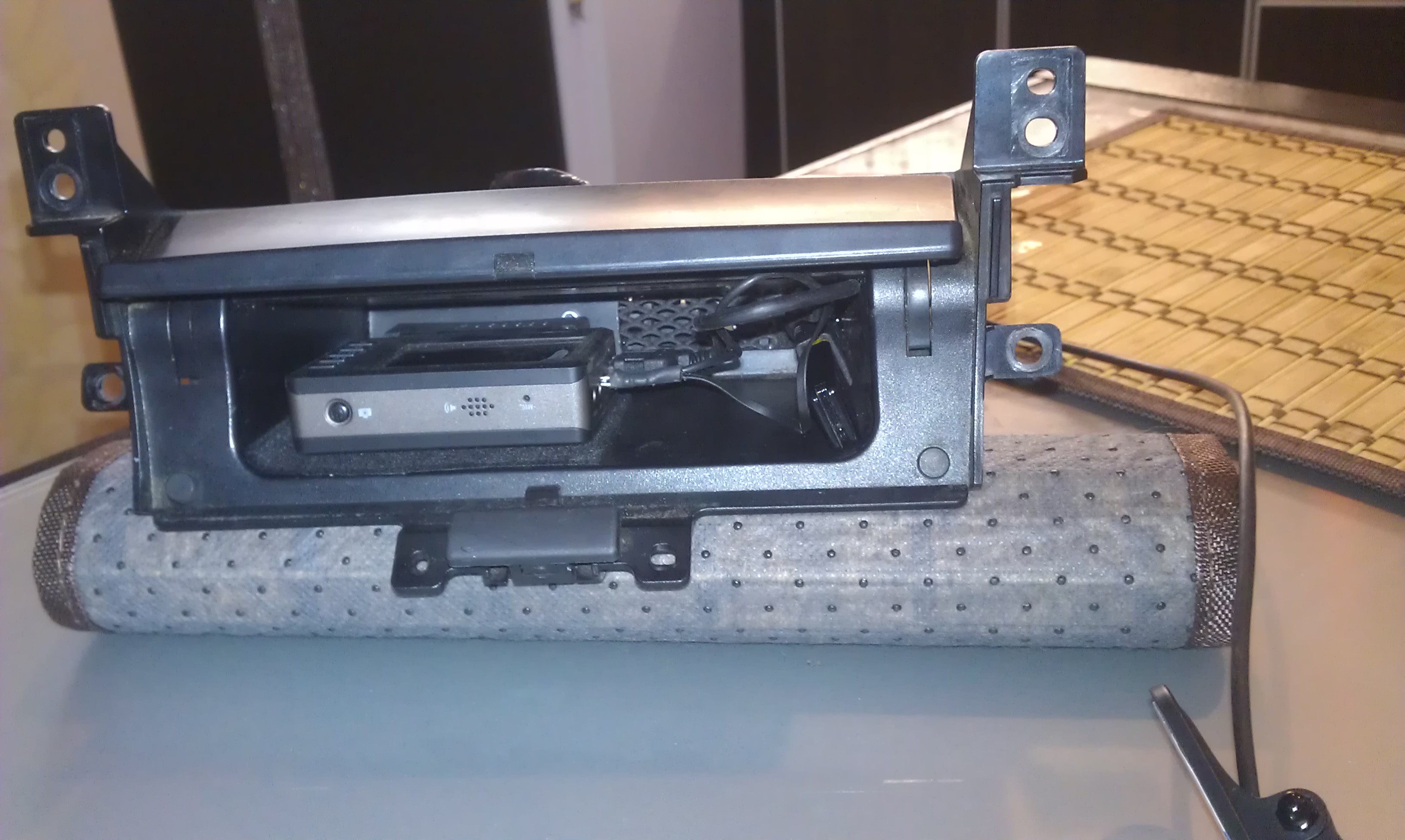 Ну и самым трудоемким моментом было создание бокса для видеорегистратора, ибо было немало требований, зачастую достаточно противоречивых. Требовался и небольшой обьем, как в очешнике,дабы избежать шансов повредить рег, чем нибудь, что валяется рядом, как это запросто может произойти в бардачке.. Но и нужно побольше воздуха для нормального охлаждения регистратора. Да и то что бардачек постоянно открывается-закрывается тоже явно не идет на пользу разъемам, поскольку кабели используются достаточно жесткие.