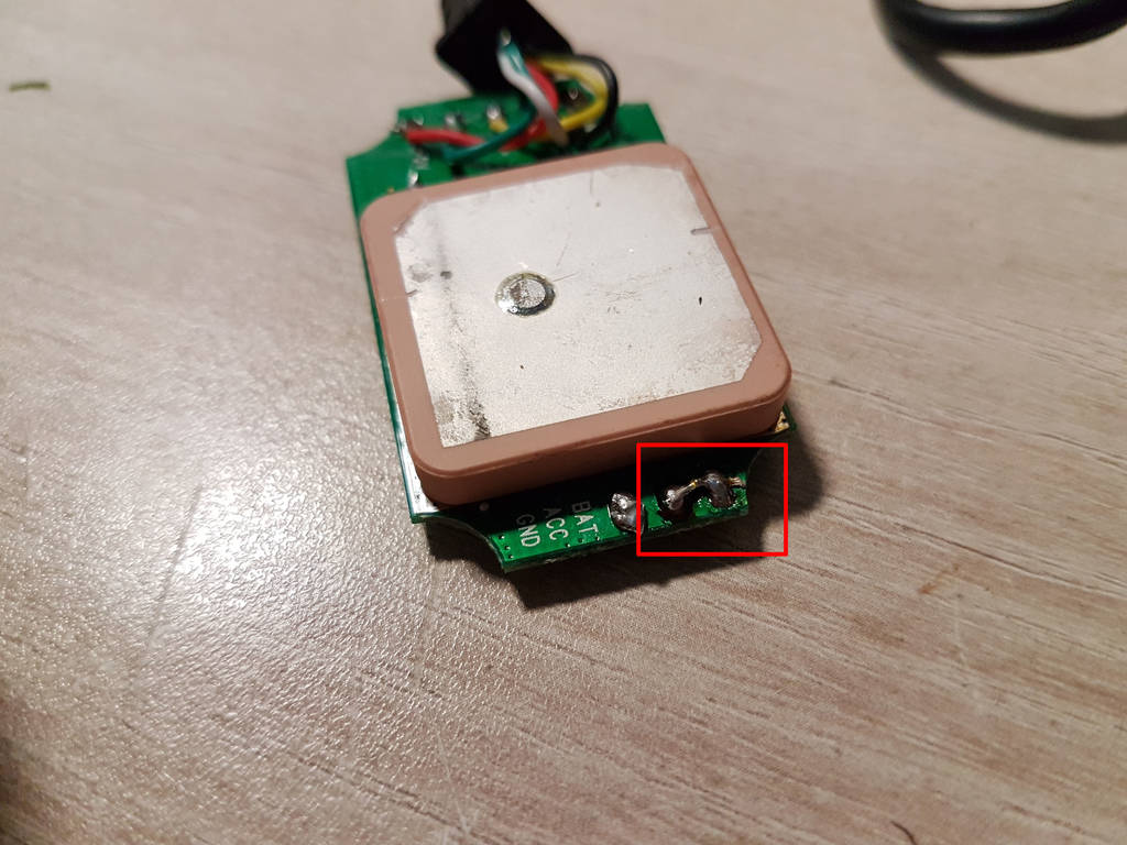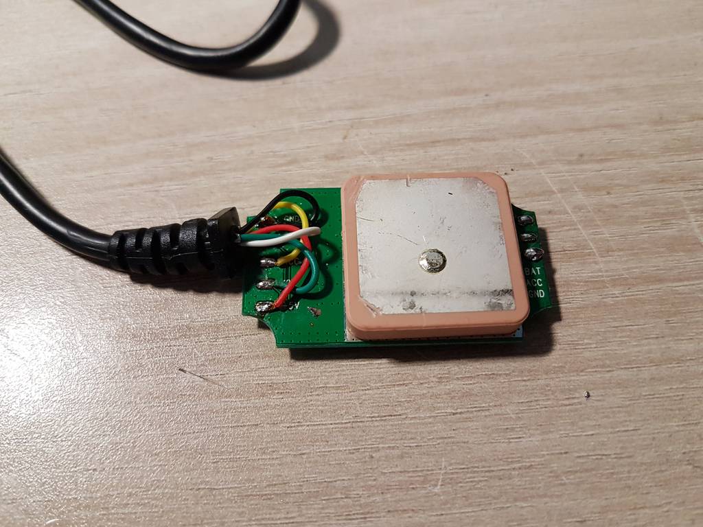 Ну и дальше я аккуратно подпаял свой провод к GND и +5V на выходе. Провод аккуратно уложил под платой (чтобы он не лежал поверх GPS антенны). Вышло как-то так: