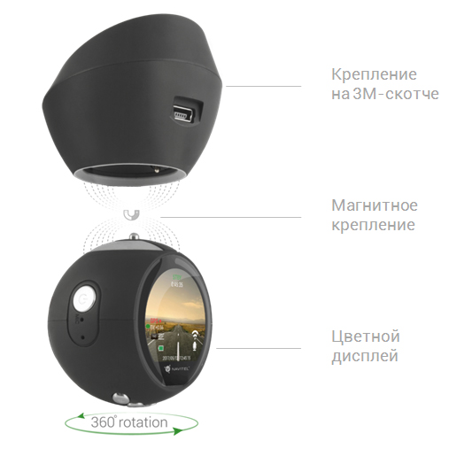 Камера регистратора NAVITEL R1000 соединена с кронштейном при помощи магнитного крепления. Это позволяет с легкостью поворачивать устройство на 360° для съемки внутри салона или сбоку от автомобиля. Кронштейн-держатель надежно крепится на лобовое стекло с помощью 3М-скотча, что обеспечивает жесткость конструкции и отсутствие вибрации.