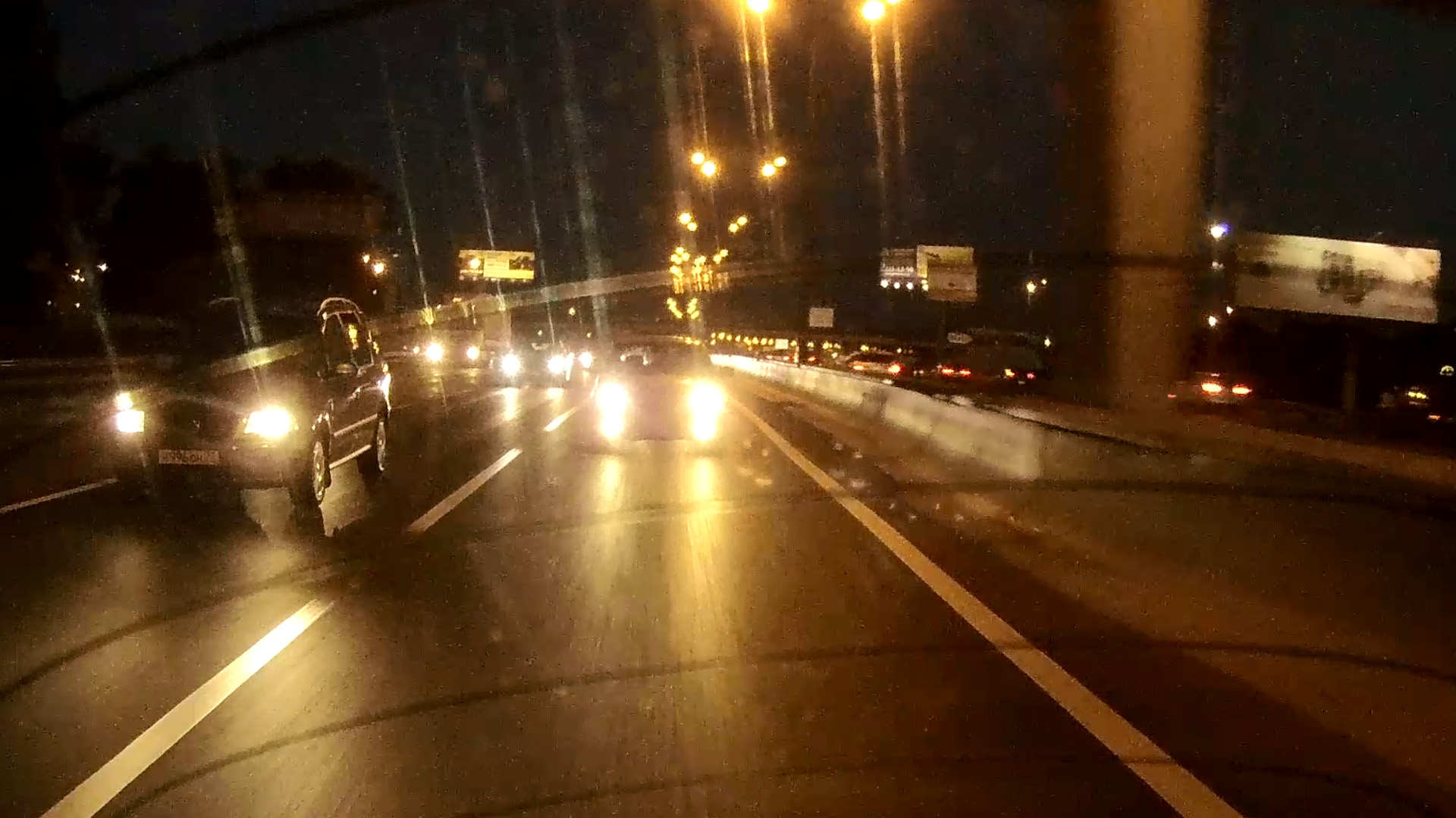 1. Внешнее освещение. Если брать два первых примера, снятых уже совсем ночью на МКАДе, то во всех роликах, включая приведенные, ни одного раза ни одного номера прочитать не удалось. Здесь же упомяну, что снова ночная съемка в режиме Super HD кажется лучше, чем в Full HD. В следующем примере для 2304 я привожу момент, когда номер читается отчетливо. Данный ролик был снят также на МКАД, но значительно раньше, некоторое время спустя после заката. Одновремено, возможно что данный участок кольцевой был чуть светлее, либо в этот момент машина удачно попала в хорошо освещенное место. В любом случае, мы видим, что от внешнего освещения, даже небольшой его прибавки многое зависит.
