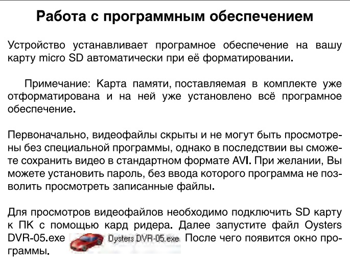 Прошу помощи по регистратору Oysters DVR-05R Достался полностью в рабочем состоянии, видео пишет, gps ловит, на регистраторе просмотреть видео можно. Но при попытке прочитать SD-карточку на компьютере - пишет что она не отформатирована и вообще не читает. Пробовал вставить в смартфон - такая же история, ничего не читается. А в регистраторе всё хорошо. Искал информацию по нему - вроде как при форматировании в самом регистраторе на карточку памяти устанавливается программа просмотра. Но похоже её нет. Какие есть варианты вытаскивать видео с данного прибора? ... Пробовал подключить к компьютеру по usb-проводу - зарядка идёт, но как накопитель не определяется, файлов не видно.