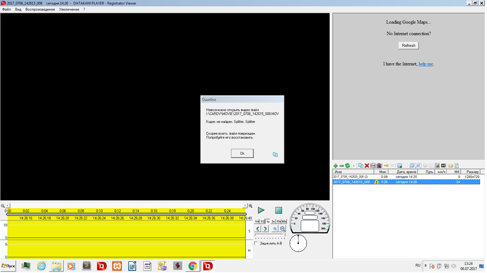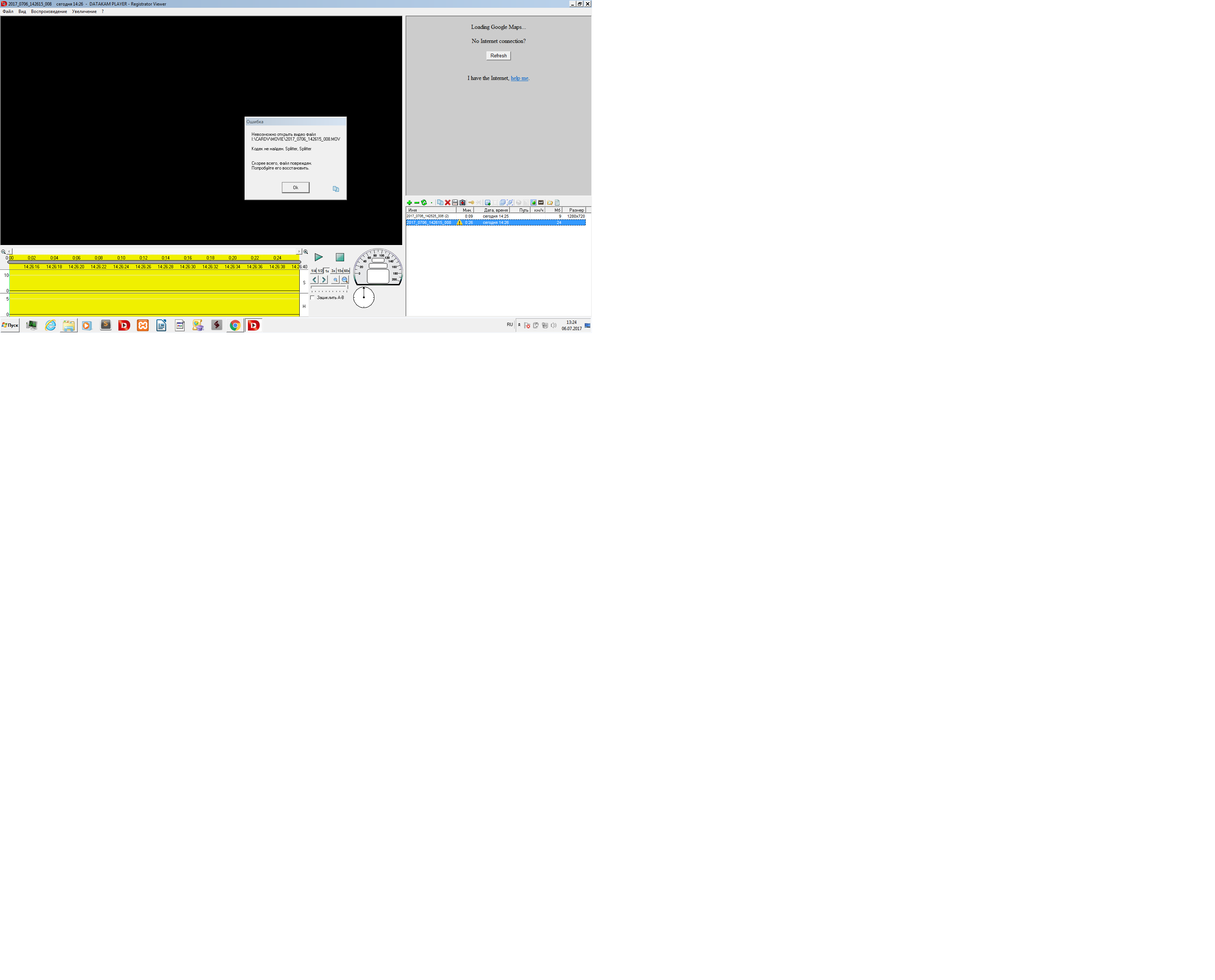 При поездке ничего необычного: на дисплее признаки записи, на карте памяти файлы есть, но... ни один из них не читается! Пишет что-то типа "файл не читается", "не тот кодек" Пробовал восстановить в DATACAM PLAYER - восстановился, но совсем из другой поездки и только видео, без скорости и, тем более - без трека!