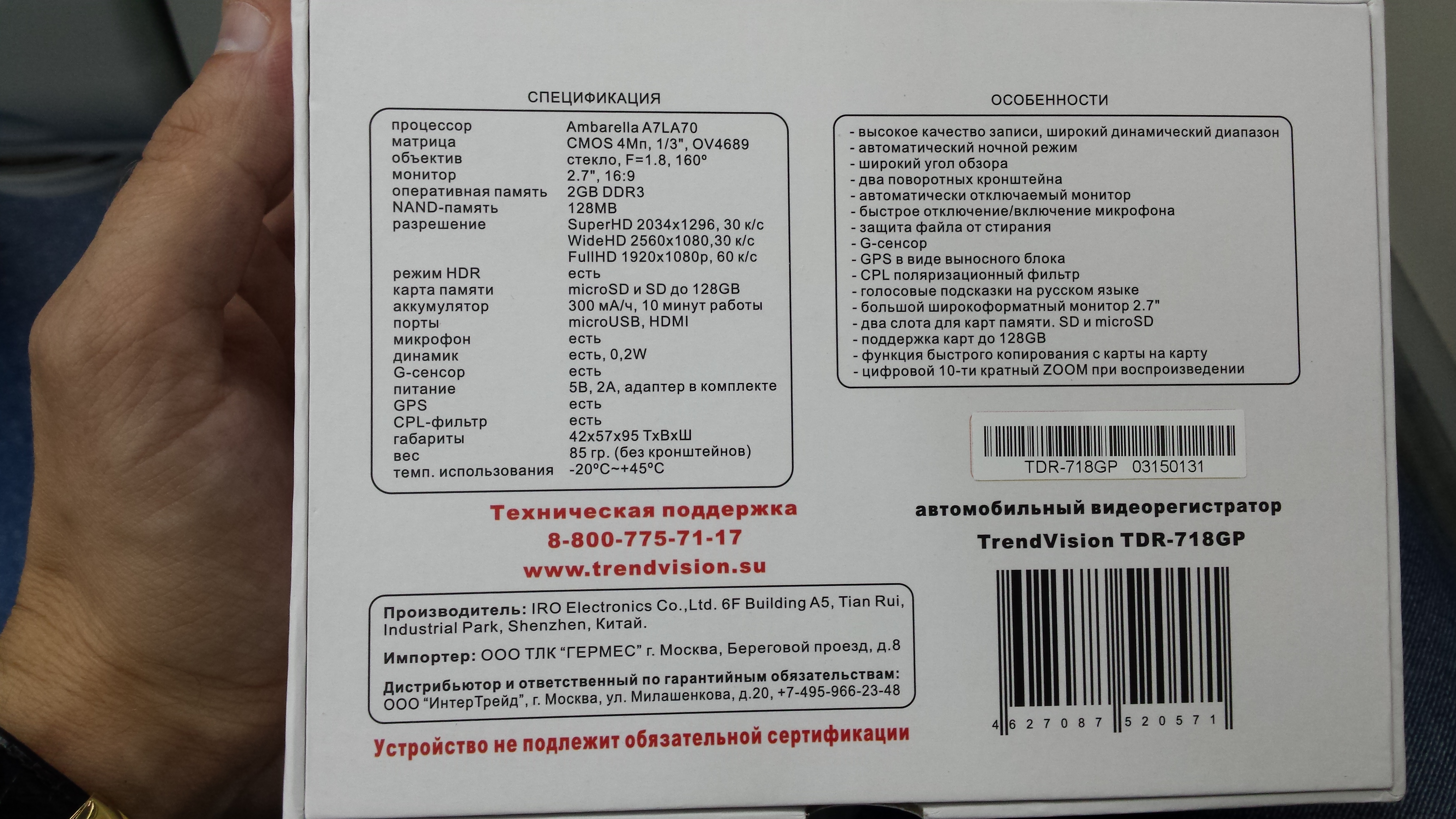 TrendVision TDR-718GP Спойлер: Характеристики Процессор - Ambarella A7LA70 Матрица - OmniVision OV4689, CMOS 1/3', 4Мп Оперативная память - 2GB DDR3 NAND память - 128MB Разрешение видео - 2304х1296p 30 к/с, 2560х1080p 30к/с, 1920x1080p 60к/с, 45к/с, 30 к/с, 1280х720p 60к/с, 30 к/с Разрешение фото - 1920х1080 Оптика - Стеклянный объектив, 6 линз, F=1.8, f=2.8мм, угол обзора - 160° (115° по горизонтали) Монитор - 2.7", высококонтрастный Внутренняя память - нет Выключение монитора - есть, автоматически, настраивается в меню, 10 сек., 30 сек., 1 мин Циклическая запись - есть, потоковая запись без пропусков между файлами, настраивается в меню, 1 мин. - 15 мин Две камеры - Нет Дополнительно в комплекте нет Температурный диапазон - от -20°С до +50°С Габариты - 95х40х54 (мм) Вес - Около 85 гр. ( без кронштейнов) Часовая батарея Суперконденсатор - 0,22Ф для сохранения даты и времени Аккумуляторная батарея - Встроенная, 300мА/ч, около 15 минут автономной работы при выключенном мониторе Режим воспроизведения - есть, стоп-кадр, ускоренная перемотка вперед/назад, замедленная перемотка вперед/назад Сжатие - Н.264 (Mpeg-4, part.10) Наложение даты и времени - есть, настраивается в меню Автоматическое включение - есть, при подаче внешнего питания, настраиваемая задержка в меню Питание - 12-24В. Зарядное устройство для автомобильного прикуривателя в комплекте Язык меню - русский, английский Карта памяти - microSD до 128GB, SD до 32GB Bit rate - 10-36 мб/с, настраивается в меню G-сенсор - есть, возможность отключать через меню GPS - есть, выносной блок CPL-фильтр - есть, быстросъемный на магните 37мм Датчик движения - есть, управление через меню Микрофон - есть, возможность отключать кнопкой или через меню Динамик - есть, регулировка громкости через меню, возможность отключать кнопкой HDMI-порт - есть, для подключения к цифровому монитору или TV, разрешение 1920х1080i AV-порт - нет USB-порт - есть, miсroUSB 2.0 Автоматическое выключение - есть, при снятии внешнего питания, настраиваемая задержка в меню Госномер - есть, настраивается в меню, 11 знаков, анг. язык и цифры Защита файлов от перезаписи - есть, кнопкой или с помощью G-сенсора Время записи на карту - 32 ГБ около 3-х часов, на карту 128ГБ около 12 часов, в максимальном разрешении Спойлер: FAQ FAQ на Google.Docs от участников форума (настройки, прошивки Оф. и МОД, SpeedCam, ссылки) Если регулярно "слетает" прошивка, регистратор отключается во время работы, горит только синий светодиод - см. по ссылкам ТП - от @ag-70 (пост.#16946 стр.848) Про повышенный битрейт (bit rate) и карты памяти: Рекомендуется использование скоростных карт памяти из-за повышенного битрейта в ПО. Чем выше битрейт - тем больше и по объему занимает места ролик на карте. Если вы не видите разницы 36мбит/сек - против 20мбит/сек, то нет смысла ставить максимальный битрейт. Как лучше всего настроить регистратор? Оптимальными настройками для всех разрешений на официальном ПО будут значения по умолчанию или (стоковые). Также можно сказать, что у всех разные предпочтения, настройки приведенные ниже для MOD’ов Trend Vision TDR-718 (MDR-710) подбирались пользователями опытным путем и считаются максимально оптимальными для дня и ночи Сравнение качества сьемки и детализации WideFHD и FullHD на разрешениях 2560x1080 и 1920x1080 (днем) пост #4874 стр.244 от @Kaliningrad ночью FullHD уже обходит WFHD по детализации Какая карта памяти необходима? В виду применения повышенного битрейта в современных видеорегистраторах, рекомендуется брать карты с запасом по скоростным характеристикам с индексом U и о