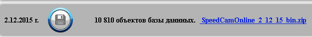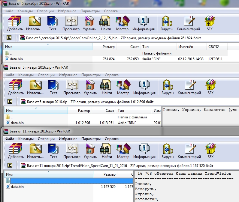 База данных предоставляется сервисом http://speedcamonline.ru на контрактной основе. Установка базы данных радаров Скачайте и распакуйте файл базы данных. Сохраните файл data.bin в корне карты памяти. Установите карту в регистратор и включите питание. На экране устройства появится сообщение: "ОБНОВИТЬ БАЗУ РАДАРОВ?" Для TDR-708, TDR-718. Джойстиком влево выберите OK и нажмите на джойстик. Для MR-700, MR-710. Кнопкой < выберите ОК и нажмите кнопку REC. Начнется обновление, по окончании надпись БАЗА ОБНОВЛЕНА. Нажмите на джойстик (для TDR-708, 718) или на кнопку REC (для MR-700, MR-710) Регистратор перезагрузится. Новая база данных установлена. 11.01.2016г. 16 708 объектов базы данных TrendVision_SpeedCam_11_01_2016 Россия, Беларусь, Украина, Казахстан, Молдова, Абхазия, Латвия, Грузия, Азербайджан, Армения 2.12.2015 г. 10 810 объектов базы даннных. SpeedCamOnline_2_12_15_bin.zip