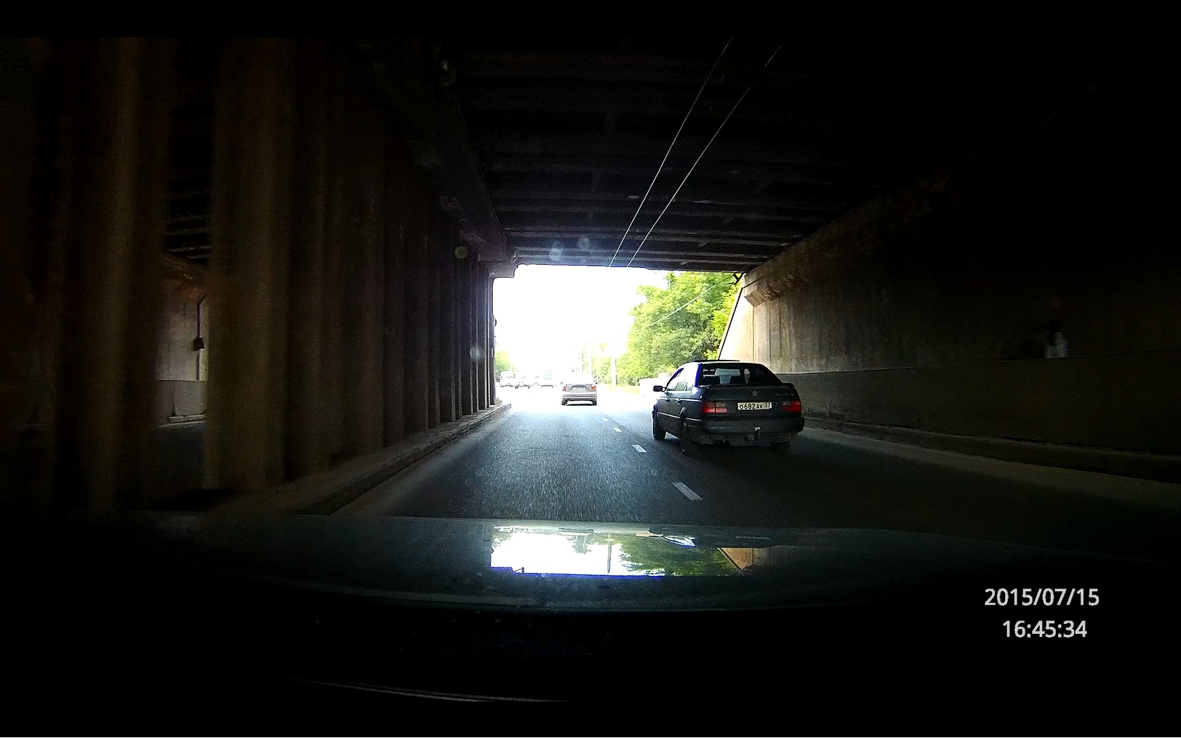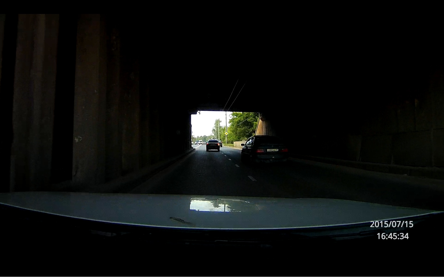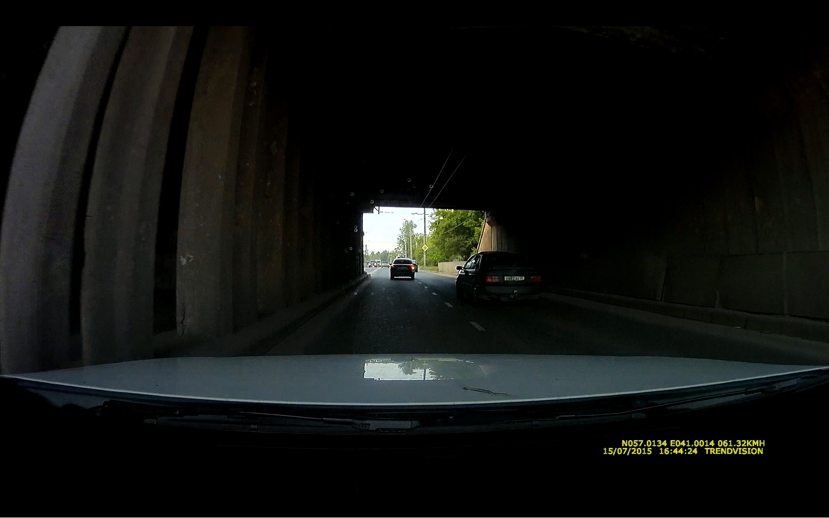 Спасибо d.Alex. Как раз то что надо, чтобы рассмотреть HDR. Понять, что такое хороший WDR сложно. Точнее непонятно что именно он должен реализовывать. Из того что я видел раньше это было совмещение двух снимков с двоением картинки при высокой скорости авто. На 718 я вижу другую реализацию WDR. Информация берется с двух снимков на кадр и объединяется в один. Картинка здесь не двоится. смотрю здесь: https://yadi.sk/i/Y5-Gic9FhtP7v - TDR-718 (путепровод 1) https://yadi.sk/i/IS9RKF9ghtP7i - G90 (путепровод 1) Слева 718 с HDR, справа G90 без HDR Сложилось впечатление, что перед въездом под путепровод HDR 718-го не задействован и ВР снимает как обычно При въезде под путепровод HDR еще не работает Под путепроводом оценивается потемневшая обстановка, HDR подключается, делаются 2 снимка на кадр, один с короткой выдержкой, другой с длиной. Потемневшая обстановка светлеет за счет кадра с более длиной выдержкой, обратите внимание, что столбы слева начинают смазываться из-за длиной выдержки (в снимках выше они не смазаны) Двоения картинки в кадрах нет. Картинка делится на две области: темная под путепроводом и светлая за ним. Темные области картинки берутся с одного снимка (с длиной выдержкой), Светлые области берутся со второго снимка (с короткой выдержкой). Наложения областей с двух снимков одновременно нет, потому и двоение отсутствует. Выезд из под путепровода смотрится не привычно Кажется, что за путепроводом появилось негативная картинка, но она позитивная. И тень под авто за путепроводом выглядит как тряпка, тень осветлена втрорым снимком HDR. Человеческий глаз по другому адаптируется к таким картинкам и ДД глаза, шире чем у матрицы. Не готов сказать, можно ли обработку двух снимков от HDR реализовать лучше или как то по другому. Но в ВР днем HDR вполне можно пользоваться, он будет вполне сносно компенсировать проезд тоннелей, крытых парковок,... Из того что я вижу на 718 HDR не включается при обычной дневной съемке. Если у кого-то есть кадры с другим поведением HDR, поделитесь оригиналами, плз