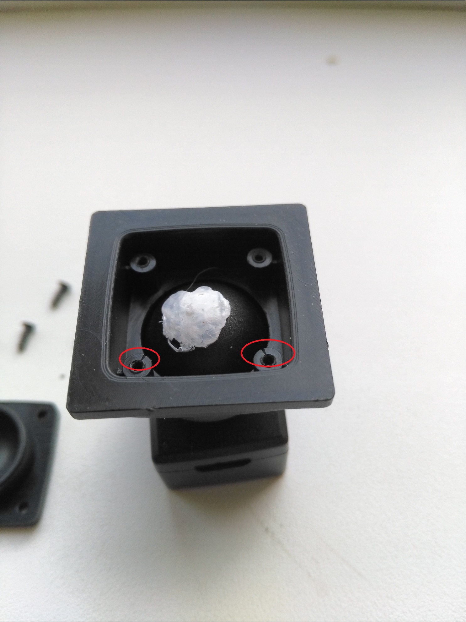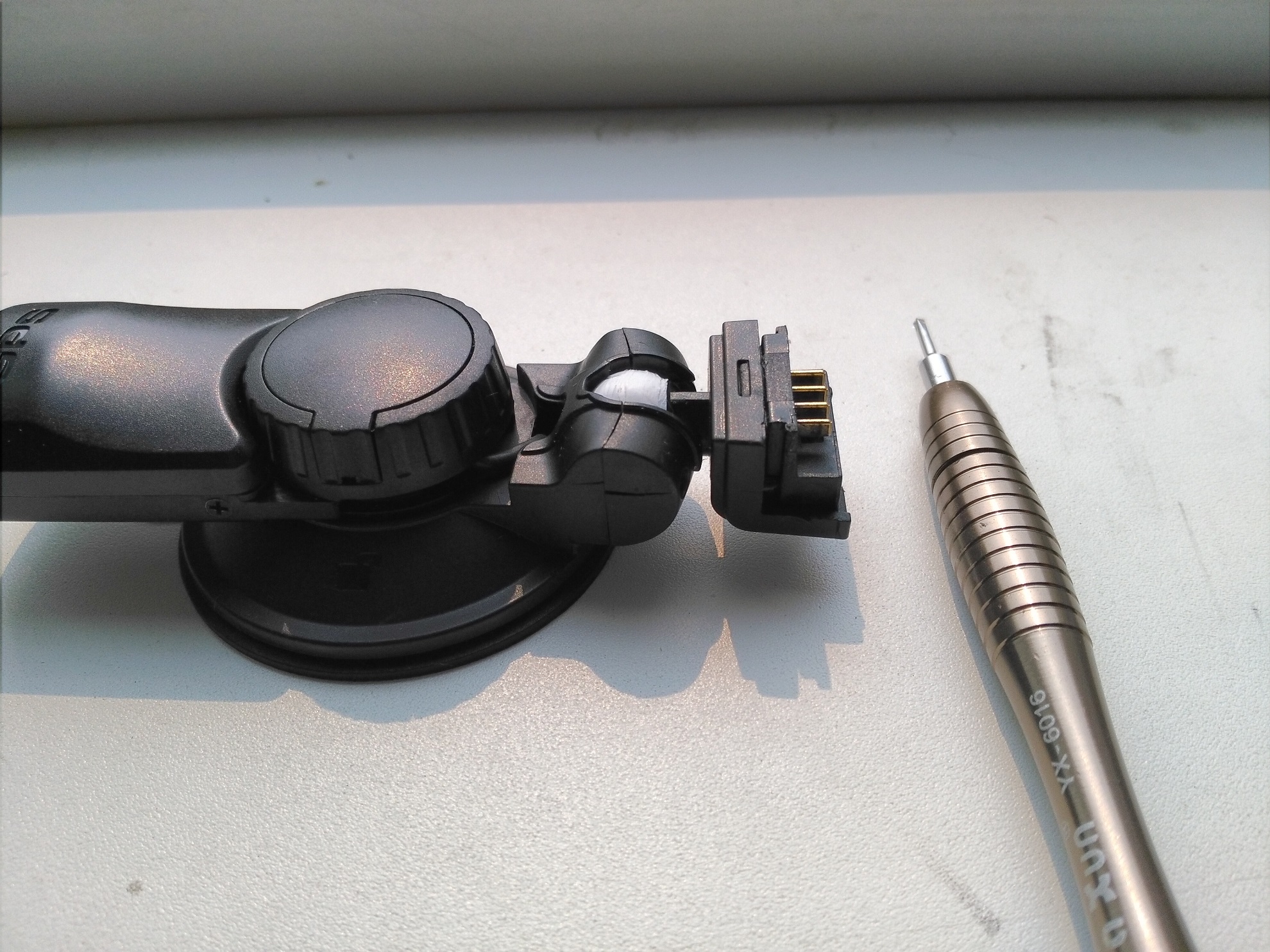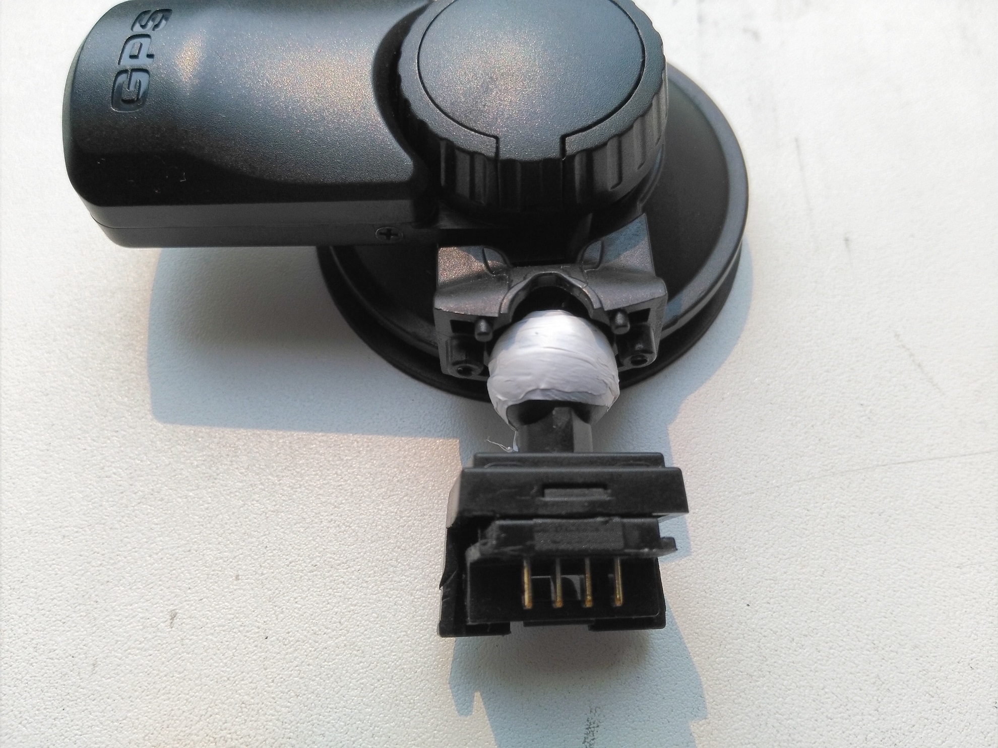 Лента фум прекрасно подойдет для решения проблемы, преимущество перед изолентой, не плывет на жаре, не дубеет на морозе, 2-3 минуты процесс ,толщина- можно добиться максимальной плотности поворотного шарнира! Лента фум различается и по размерам: толщина колеблется от 0.075 до 0.25 мм. Источник: http://gidroguide.ru/material/len-ili-lenta-fum.html От TV718 под рукой кронштейна нет, для примера от SS. Вернемся к поворотному креплению уже ТV 718 Откручиваем 4 винтика. Затем катаем катыш из ленты фум и набиваем квадратик шарнира, плотно фум ленту. Косяк Красным цветом отметил на 3 фото, трещины которые могут служить причиной ослабленного поворотного крепления. Я на своем ВР аккуратно проклеил для прочности эпоксидным клеем( 5 минуткой ), после полного отвердевания можно собирать крепление и устанавливать на авто. Главное при закручивание винтиков, не спешить, и не сорвать! В итоге получается, плотное поворотное!