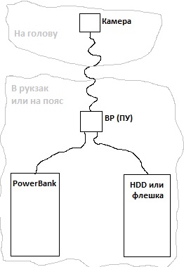Необходим видеорегистратор для ведения постоянной-непрерывной съемки во время путешествий, то есть с утра включил и пошла съёмка, и только вечером перед сном выключил. А значить должны быть следующие характеристики: - С подключением внешнего накопителя памяти (HDD или флешка), чтобы во время путешествия не менять карты памяти: отслеживать их заполнение по часам - меняя вовремя, разделять записанные карты и пустые, нумеровать записанные карты по последовательности записи на них; - С возможностью подключения внешнего аккумулятора (PowerBank), чтобы хватило на целый день непрерывной съемки, с заменой лишь раз в сутки; - Маленькая и легкая внешняя проводная-выносная камера без дополнительных устройств, чтобы размещать её на голове, пристегнутой к головному убору или очкам, чтобы меньше ощущать её присутствие (не напрягала); - Не обязательно, но желательно, либо без встроенных: аккумулятора, памяти и камеры, либо с возможностью их отключения и съёма, то есть в чистом виде - пульт управления. Или возможно рассмотрения использования в этой роли смартфона. - Чтобы была возможность: память, питание и пульта управления размещать в кармане рюкзака или на поясе, а на голове держать только одну камеру. Схему прилагаю. Модели Экшен-Камер, представленные на рынке, объединяют в едином корпусе сразу камеру, блок питания и память, что в итоге приводит к следующим минусам: - Громоздкости и тяжести, что достаточно ощутимо ощущать на голове, особенно в походе в тяжелых условиях, например, высокогорья; - Меленький объем памяти, которого не хватает даже на один день непрерывной съемки, а заморачиваться в условиях высокогорного похода с мелкими картами памяти нет возможности; - Маленький объем аккумулятора, которого хватает и того меньше (правда есть модели с возможность подключения внешнего питания). Можете посоветовать модели ВР с возможностью внешних подключений, и проводных-выносных камер к ним?