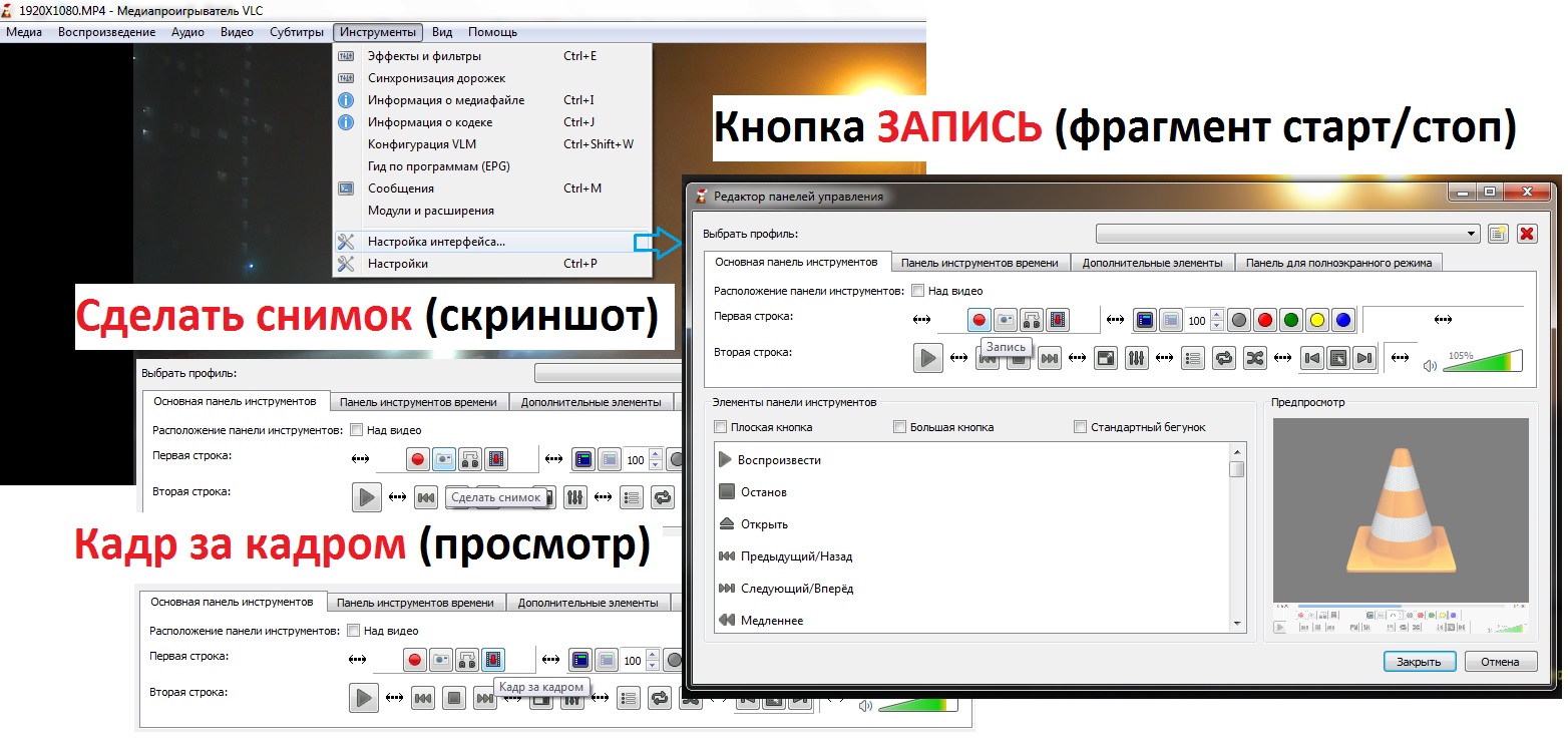 Плеер позволяет делать скриншоты (стоп-кадры) с экрана и вырезать фрагменты из роликов. Для вырезки фрагмента: 1.При проигрывании видео нажать кнопку ЗАПИСЬ для обозначения начала/старта нужного фрагмента 2.Повторным нажатием кнопки ЗАПИСЬ фрагмент сохранится По умолчанию фрагмент сохранится в папку Видеозаписи с именем "vlc-record-дата записи-имя исходного файла" Инструменты: Настройка места сохранения фото (скриншота) --- Сообщения Объединены, 25 дек 2016 --- Описание настроек и доп.функций в VLC-плеере https://3dnews.ru/626166